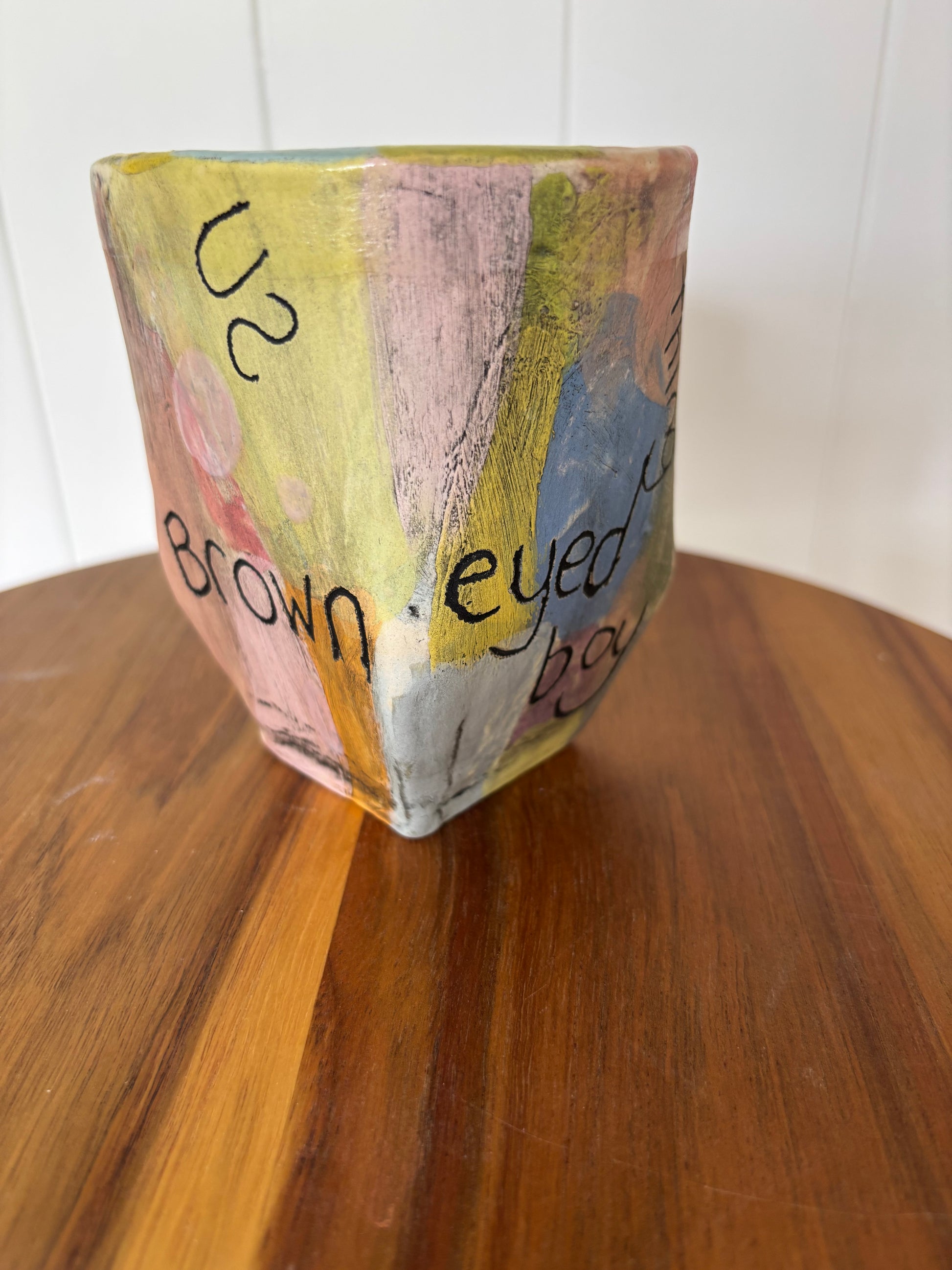 meets brown eyed boy mug...... Smoky pastel hues with a glazed shiny interior.