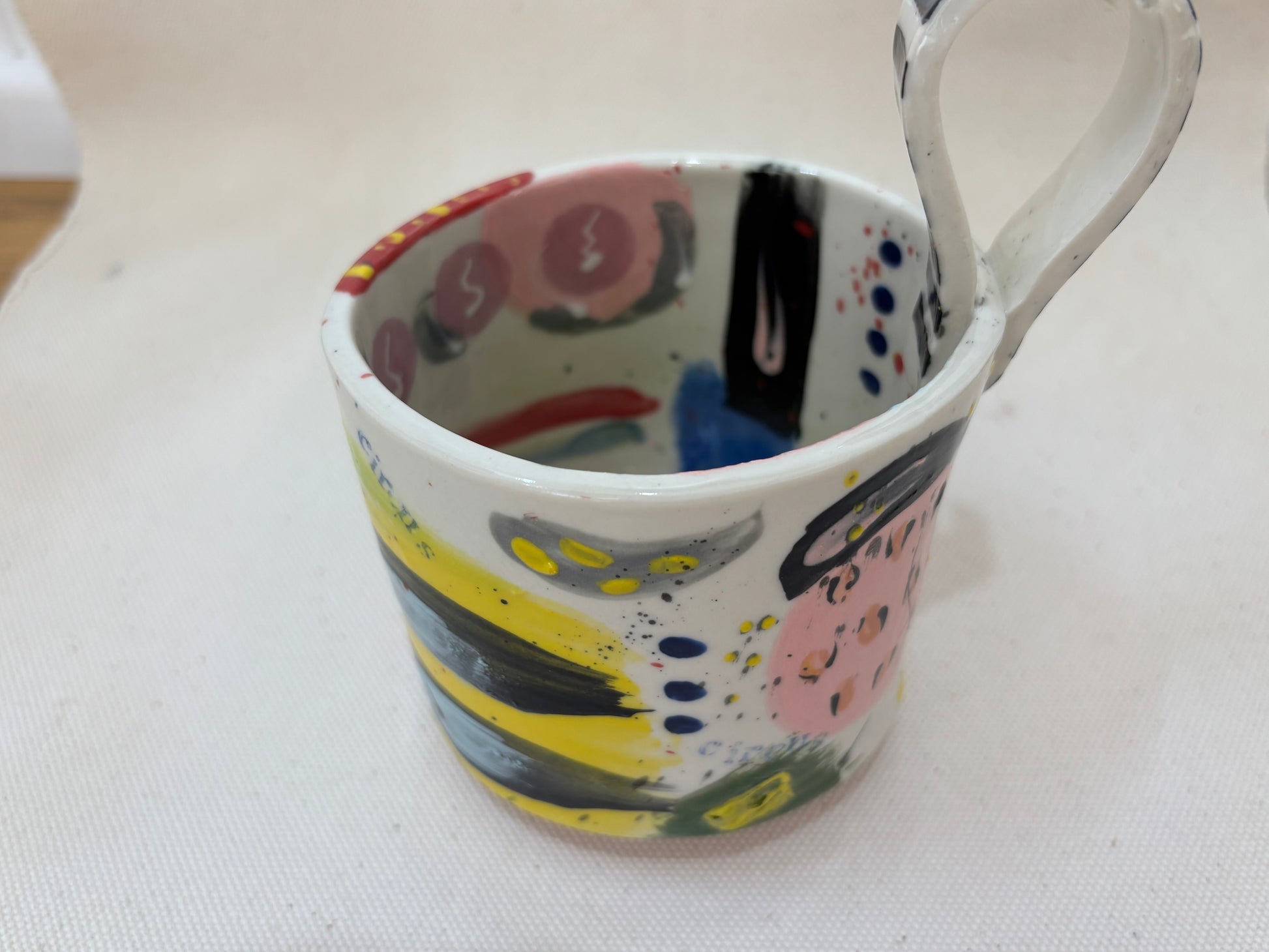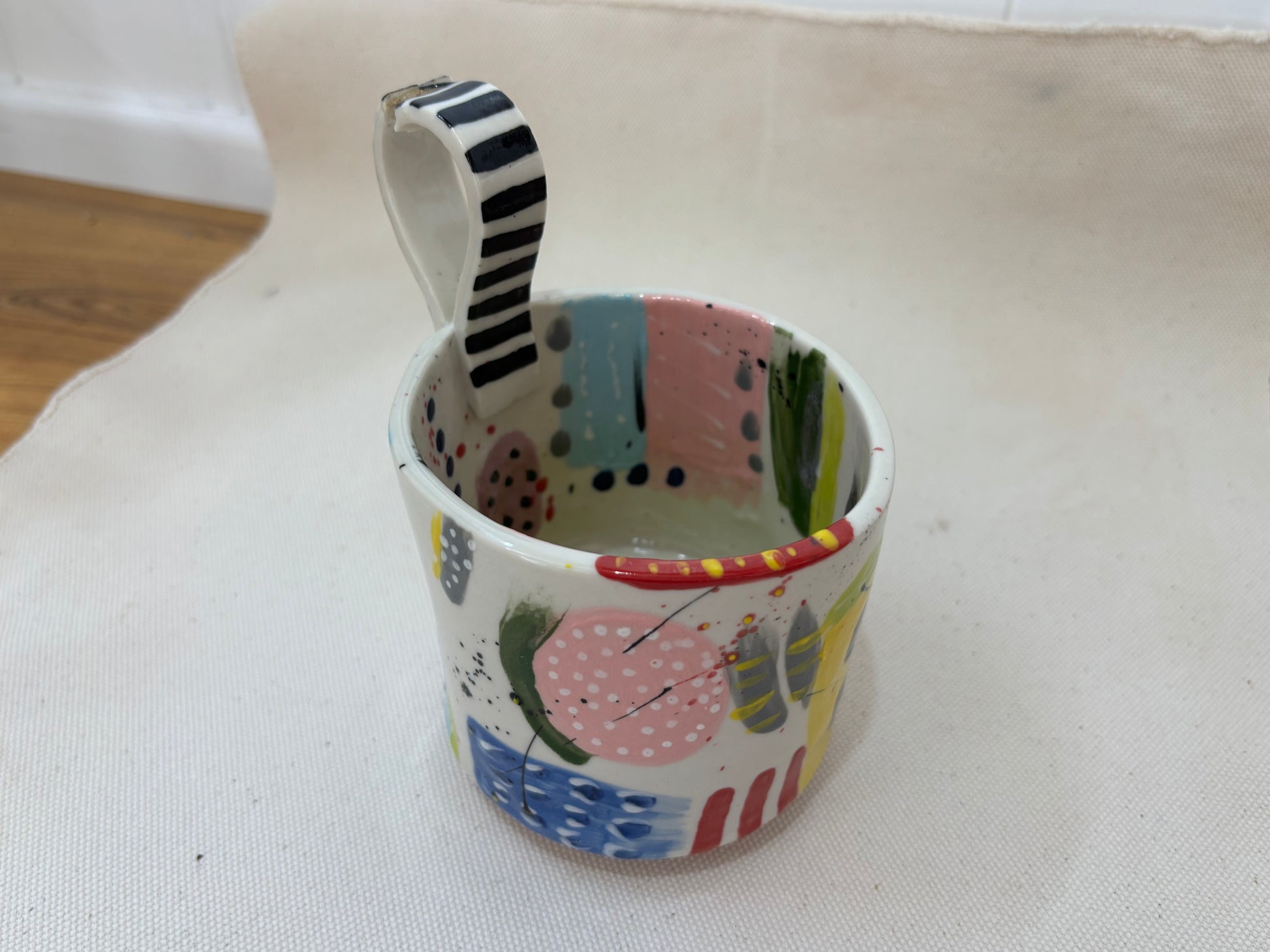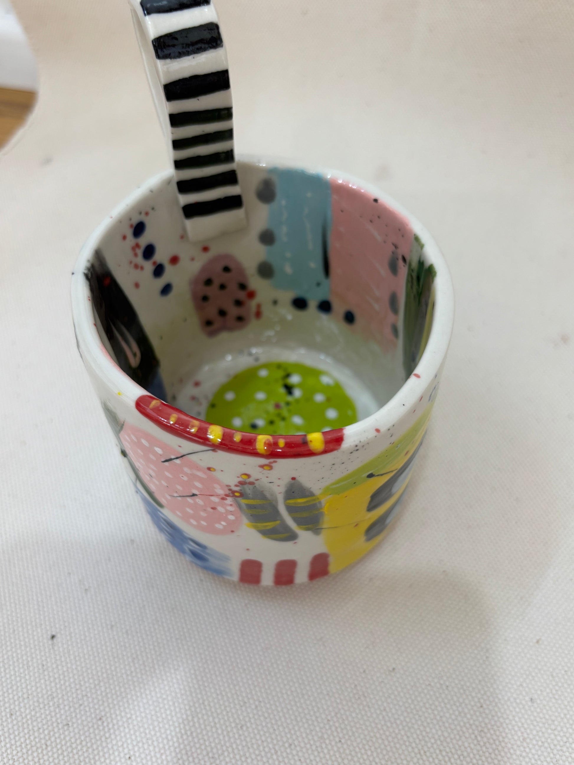 A joyous explosion of color and pattern, the Carnival Whirl Mug captures the playful chaos of a circus parade. Hand-painted with candy stripes, polka dots, confetti splatters, and abstract flourishes in pastel and primaries, this mug is bursting with character from every angle. The dramatically striped handle adds a punch of drama — a nod to vintage circus tents and ringmaster suits. Inside, a splash of bright green anchors the composition, like a hidden surprise at the bottom of a popcorn bucket. A perfect piece for anyone who loves their mornings as bold as a brass band.