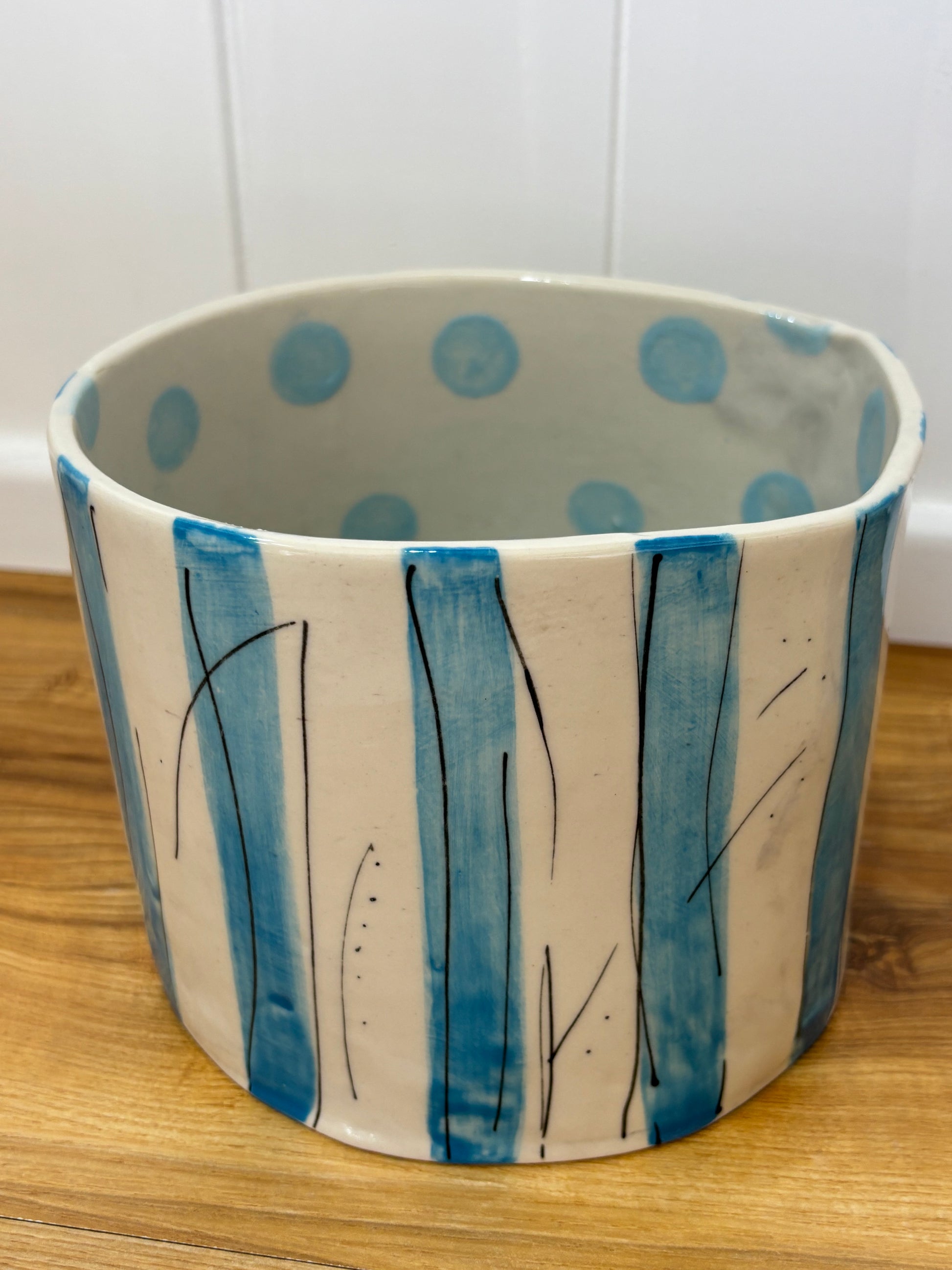 A handbuilt ceramic vessel with cool, painterly blue stripes and delicate inky linework — reminiscent of a striped circus tent at twilight. Inside, oversized sky-blue polka dots add a playful surprise. Use it as a planter, utensil holder, or statement piece that brings calm and curiosity in equal measure.