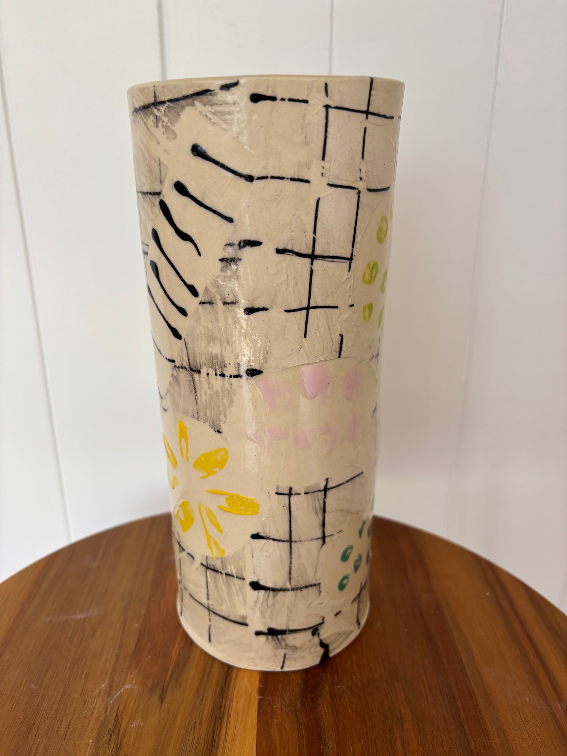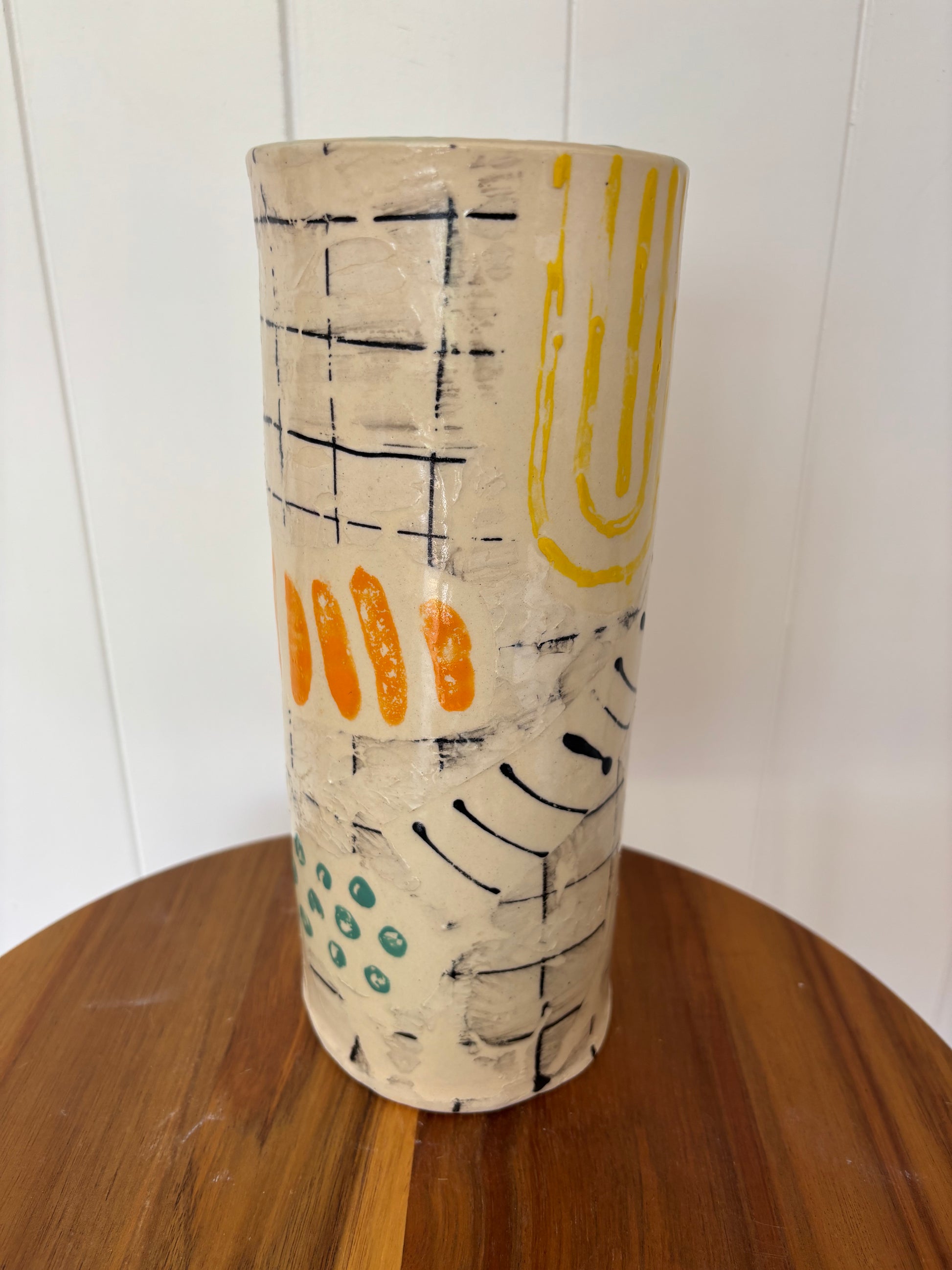 A tall vase with a white glossy interior with abstract images decorating the exterior. Understated but funky.