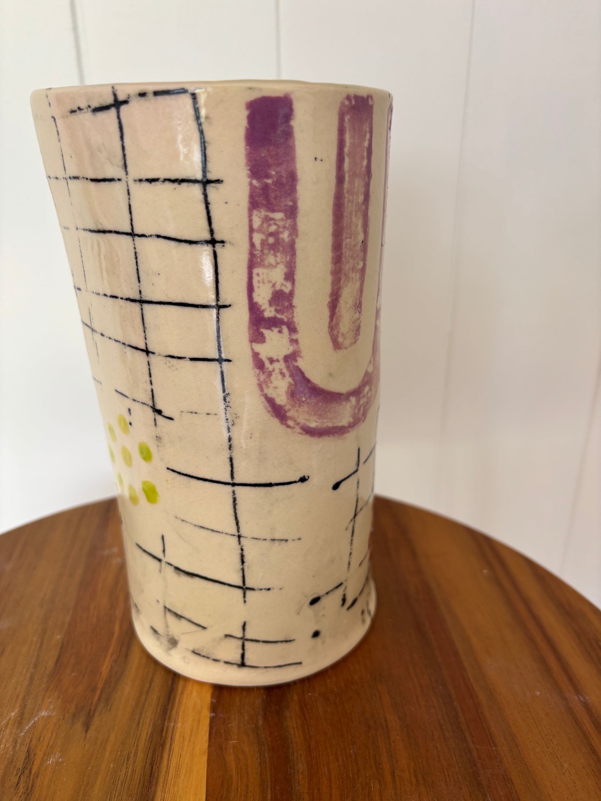 A tall round vase with abstract images and a cheeky wee Pukeko. A fun and functional vessel.