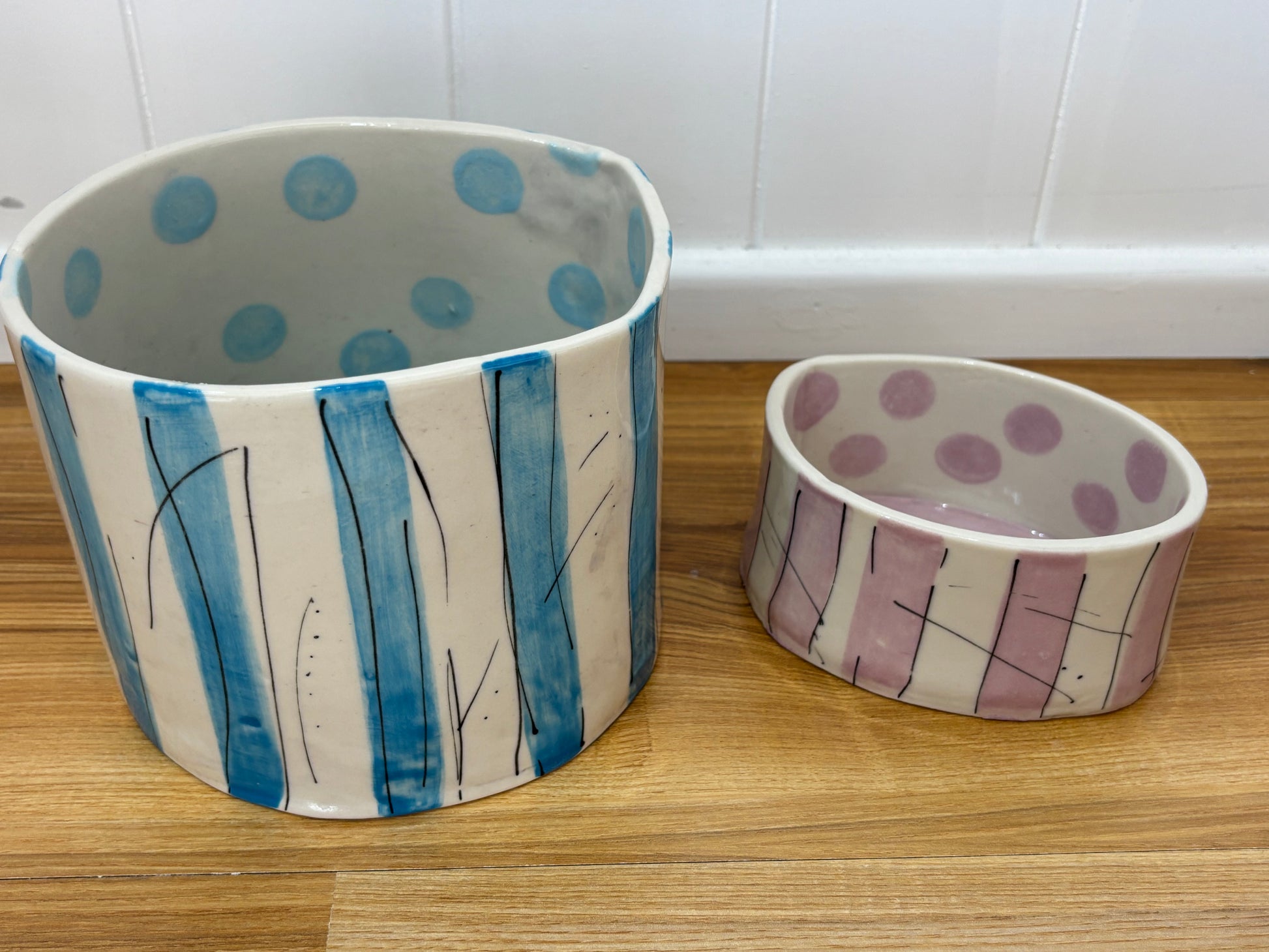A smaller version of the Circus tent this handbuilt ceramic vessel with cool, lilac stripes and delicate inky linework — reminiscent of a striped circus tent at twilight. Inside, oversized lilac polka dots add a playful surprise.